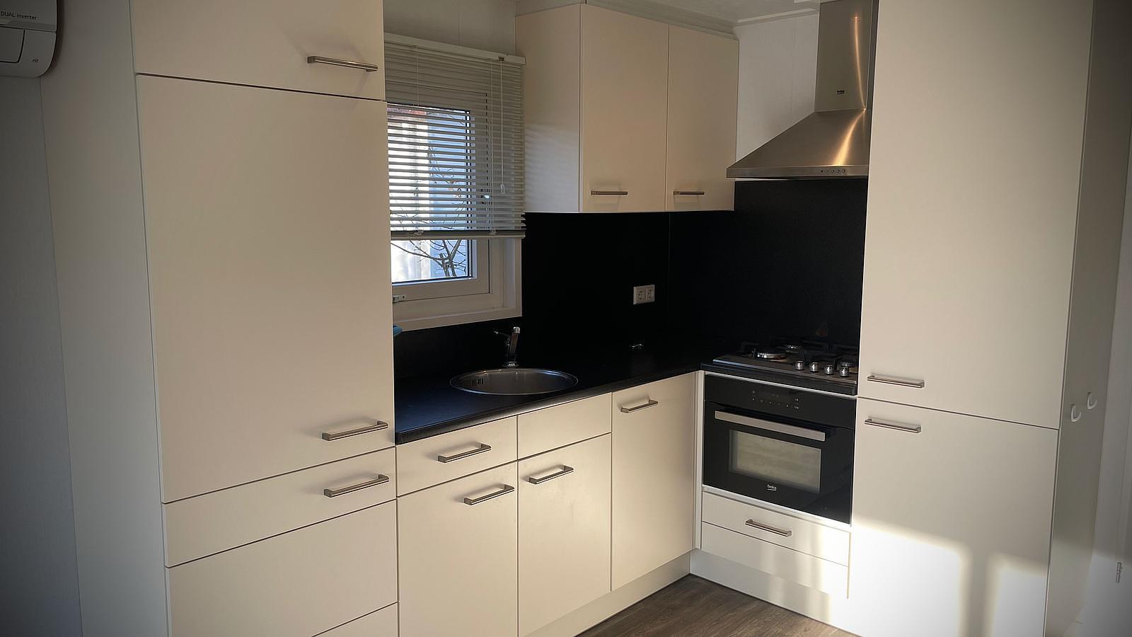 de keuken heeft een 4pits gaskookplaat oven koelkast en afzuigkap.